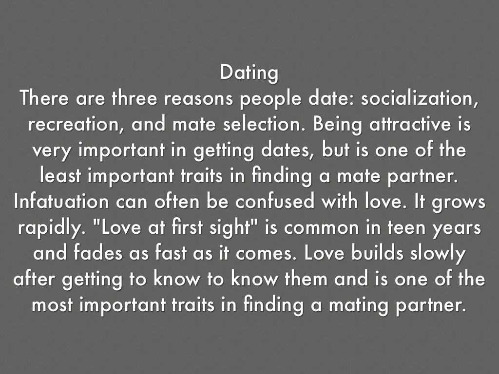 There are three reasons people date: socialization, recreation, and mate selection. Being attractive is very important in getting dates, but is one of the least important traits in finding a mate partner. Infatuation can often be confused with love. It grows rapidly. "Love at first sight" is common in teen years and fades as fast as it comes. Love builds slowly after getting to know to know them and is one of the most important traits in finding a mating partner.