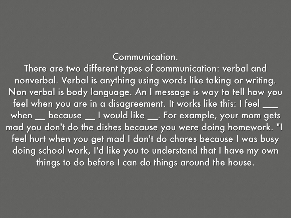 There are two different types of communication: verbal and nonverbal. Verbal is anything using words like taking or writing. Non verbal is body language. An I message is way to tell how you feel when you are in a disagreement. It works like this: I feel ___ when __ because __ I would like __. For example, your mom gets mad you don't do the dishes because you were doing homework. "I feel hurt when you get mad I don't do chores because I was busy doing school work, I'd like you to understand that I have my own things to do before I can do things around the house.