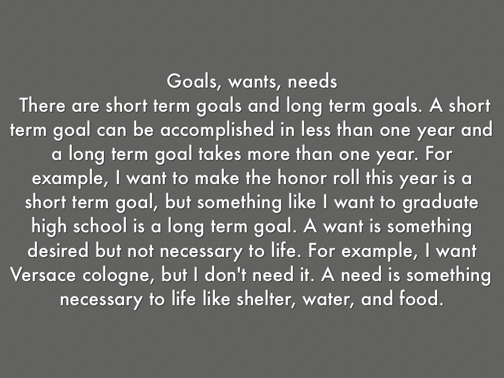 There are short term goals and long term goals. A short term goal can be accomplished in less than one year and a long term goal takes more than one year. For example, I want to make the honor roll this year is a short term goal, but something like I want to graduate high school is a long term goal. A want is something desired but not necessary to life. For example, I want Versace cologne, but I don't need it. A need is something necessary to life like shelter, water, and food.