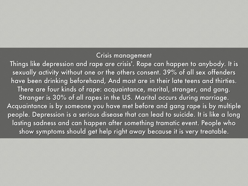 Things like depression and rape are crisis'. Rape can happen to anybody. It is sexually activity without one or the others consent. 39% of all sex offenders have been drinking beforehand, And most are in their late teens and thirties. There are four kinds of rape: acquaintance, marital, stranger, and gang. Stranger is 30% of all rapes in the US. Marital occurs during marriage. Acquaintance is by someone you have met before and gang rape is by multiple people. Depression is a serious disease that can lead to suicide. It is like a long lasting sadness and can happen after something tramatic event. People who show symptoms should get help right away because it is very treatable.