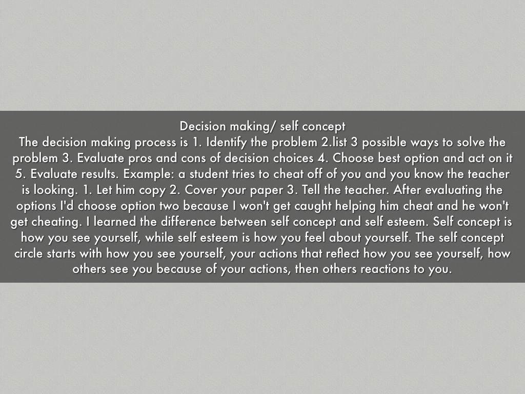 The decision making process is 1. Identify the problem 2.list 3 possible ways to solve the problem 3. Evaluate pros and cons of decision choices 4. Choose best option and act on it 5. Evaluate results. Example: a student tries to cheat off of you and you know the teacher is looking. 1. Let him copy 2. Cover your paper 3. Tell the teacher. After evaluating the options I'd choose option two because I won't get caught helping him cheat and he won't get cheating. I learned the difference between self concept and self esteem. Self concept is how you see yourself, while self esteem is how you feel about yourself. The self concept circle starts with how you see yourself, your actions that reflect how you see yourself, how others see you because of your actions, then others reactions to you.