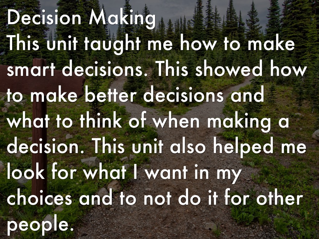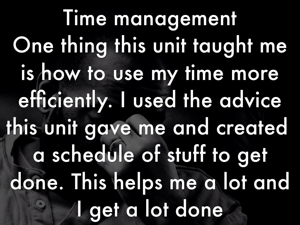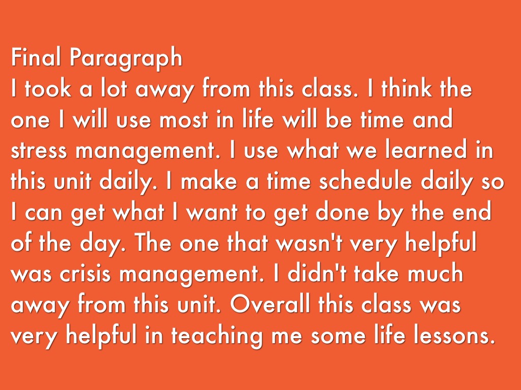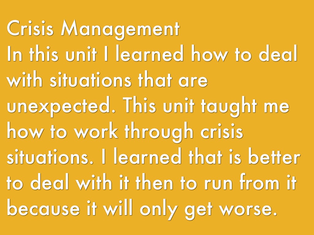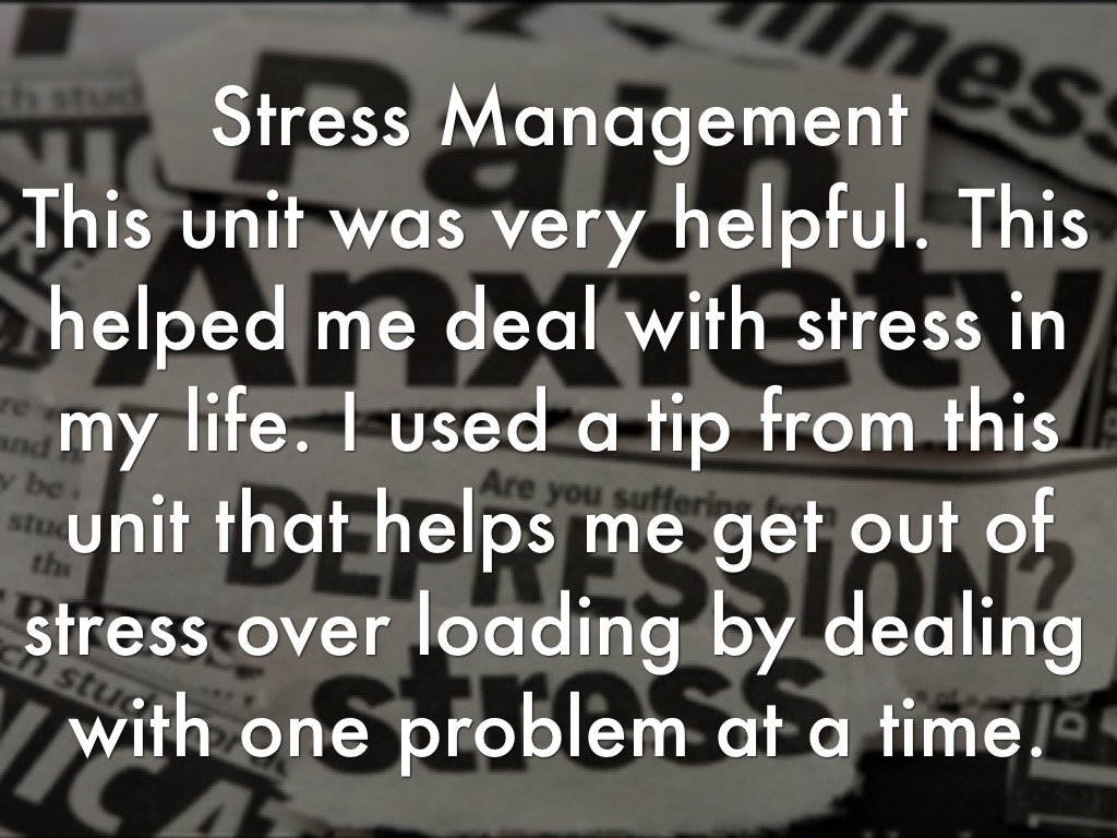 I took a lot away from this class. I think the one I will use most in life will be time and stress management. I use what we learned in this unit daily. I make a time schedule daily so I can get what I want to get done by the end of the day. The one that wasn't very helpful was crisis management. I didn't take much away from this unit. Overall this class was very helpful in teaching me some life lessons.