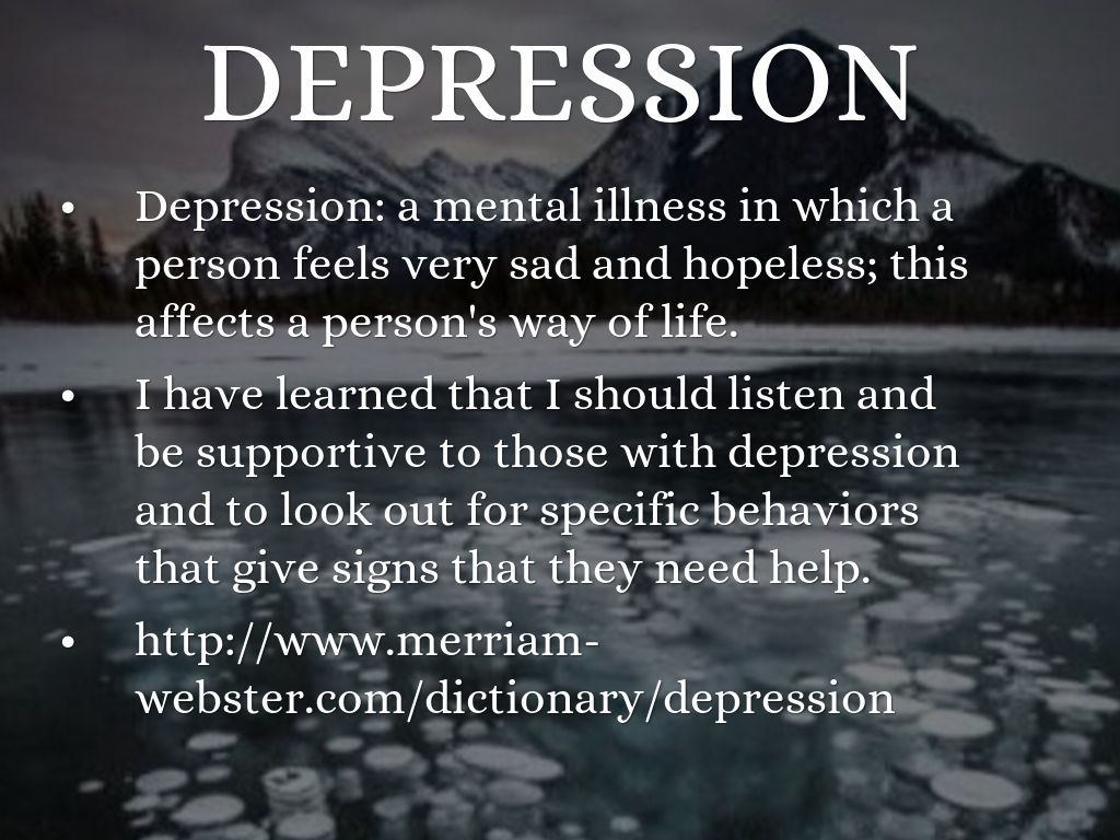 Depression: a mental illness in which a person feels very sad and hopeless; this affects a person's way of life.