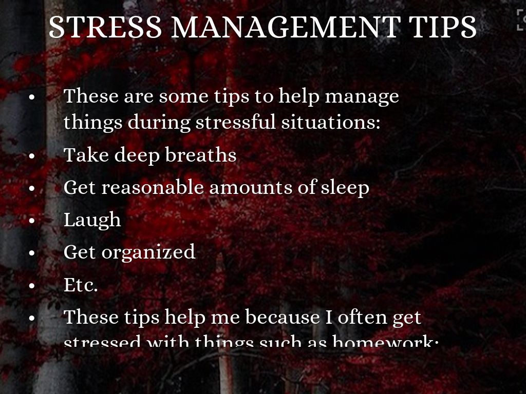 These tips help me because I often get stressed with things such as homework; one tip I use is getting organized. I make sure I know exactly what to do and when each thing is due. Also, having a planner helps me achieve organization.