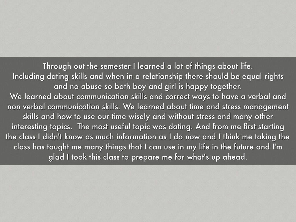 We learned about communication skills and correct ways to have a verbal and non verbal communication skills. We learned about time and stress management skills and how to use our time wisely and without stress and many other interesting topics. The most useful topic was dating. And from me first starting the class I didn't know as much information as I do now and I think me taking the class has taught me many things that I can use in my life in the future and I'm glad I took this class to prepare me for what's up ahead.