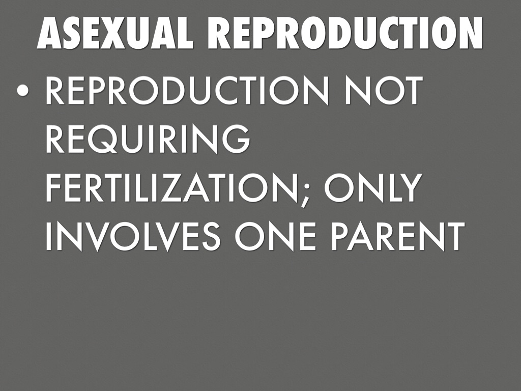 • REPRODUCTION NOT REQUIRING FERTILIZATION; ONLY INVOLVES ONE PARENT