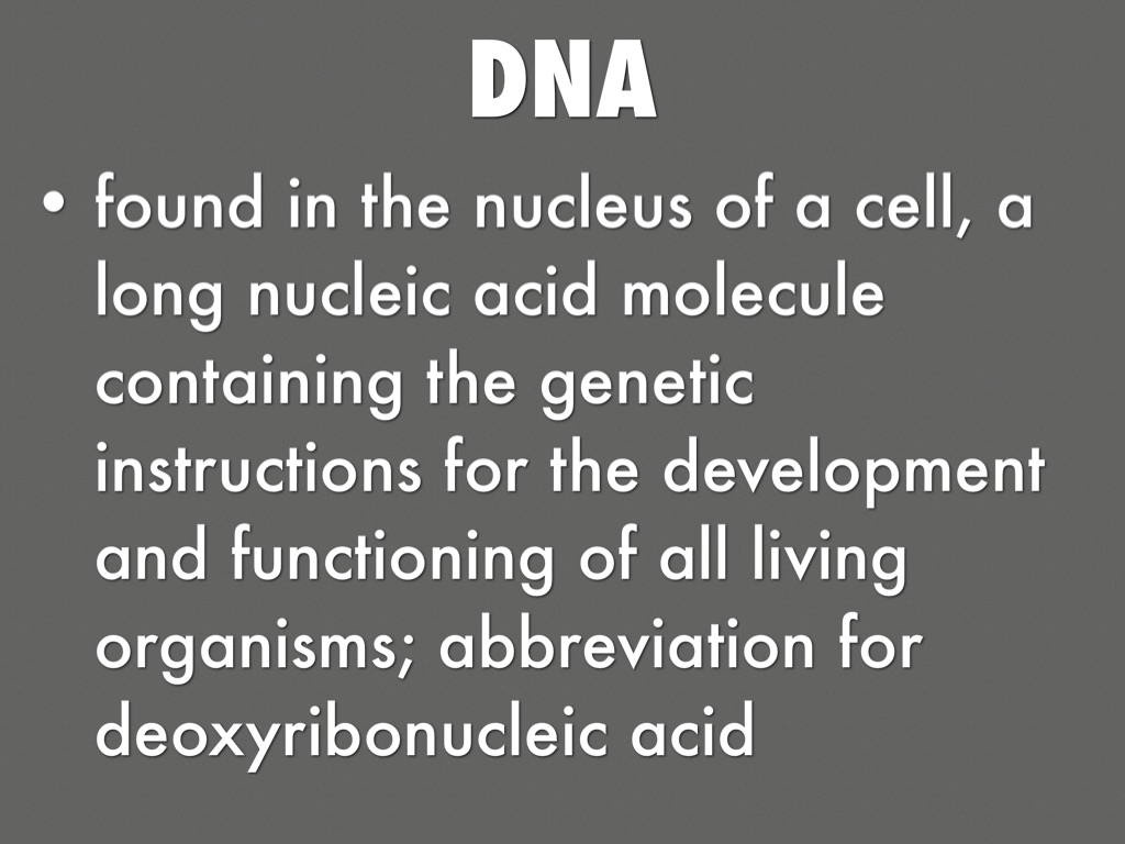 • found in the nucleus of a cell, a long nucleic acid molecule containing the genetic instructions for the development and functioning of all living organisms; abbreviation for deoxyribonucleic acid