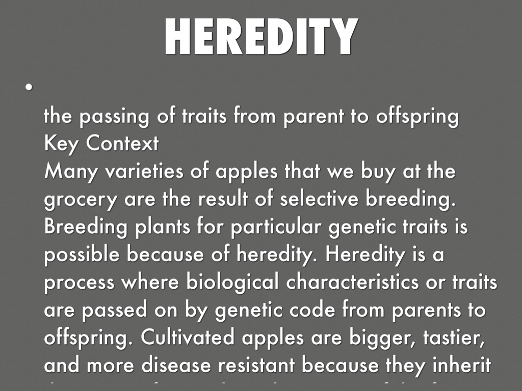• the passing of traits from parent to offspring Key Context Many varieties of apples that we buy at the grocery are the result of selective breeding. Breeding plants for particular genetic traits is possible because of heredity. Heredity is a process where biological characteristics or traits are passed on by genetic code from parents to offspring. Cultivated apples are bigger, tastier, and more disease resistant because they inherit those traits from selected varieties of the fruit.