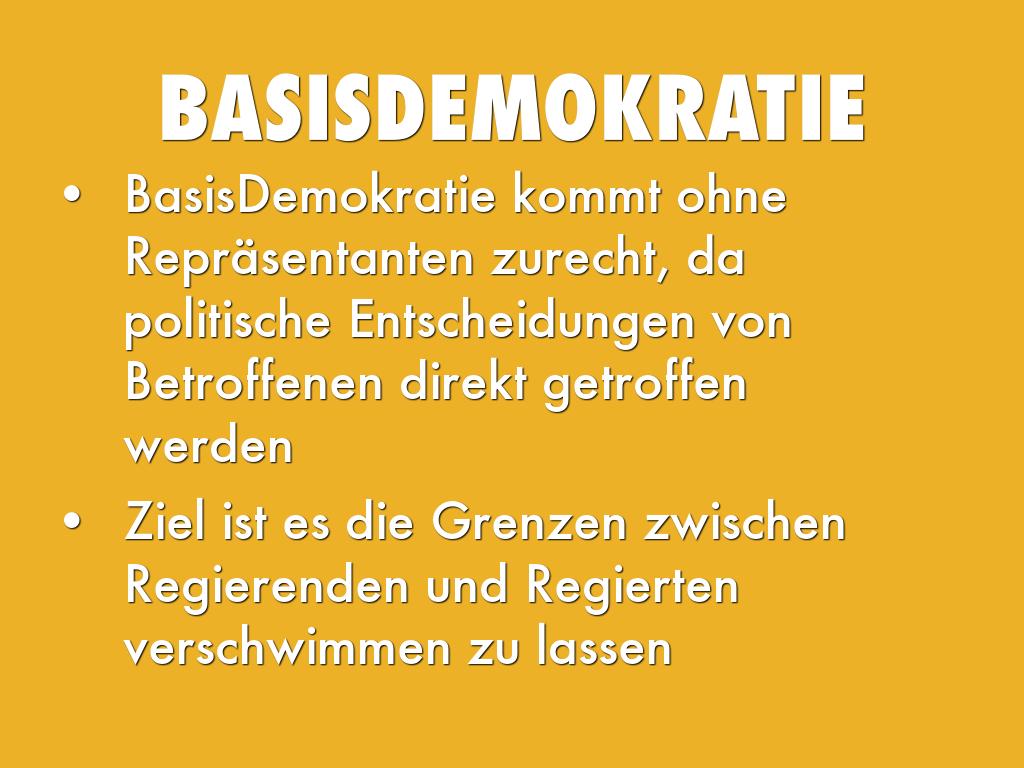 BasisDemokratie kommt ohne Repräsentanten zurecht, da politische Entscheidungen von Betroffenen direkt getroffen werden