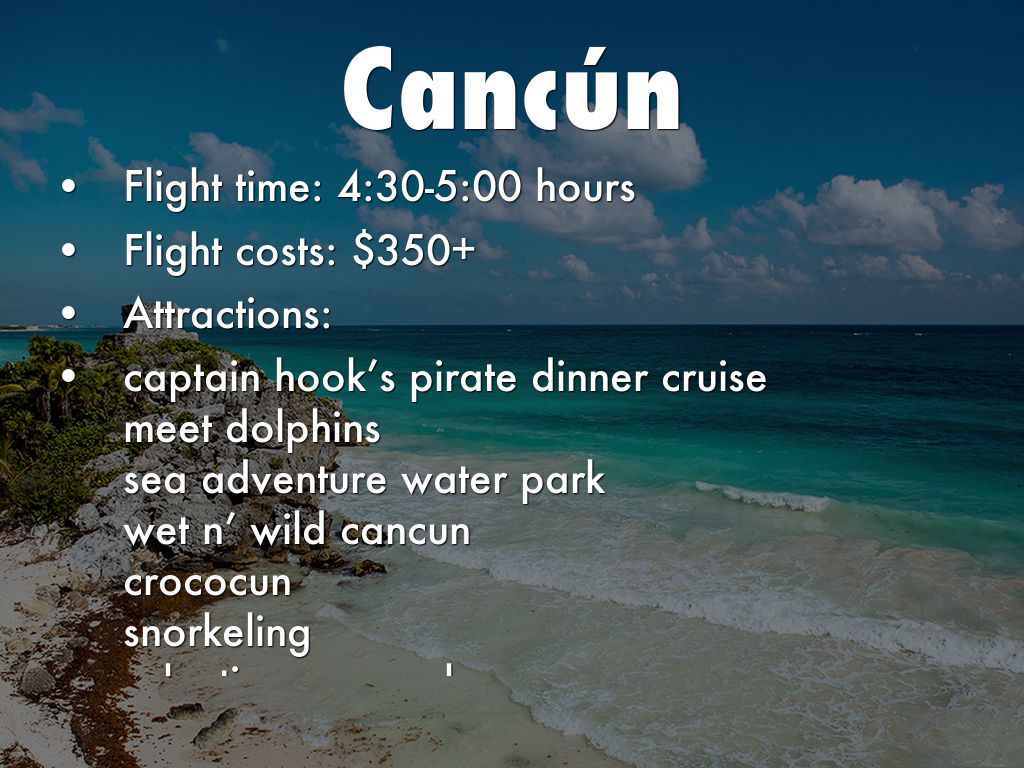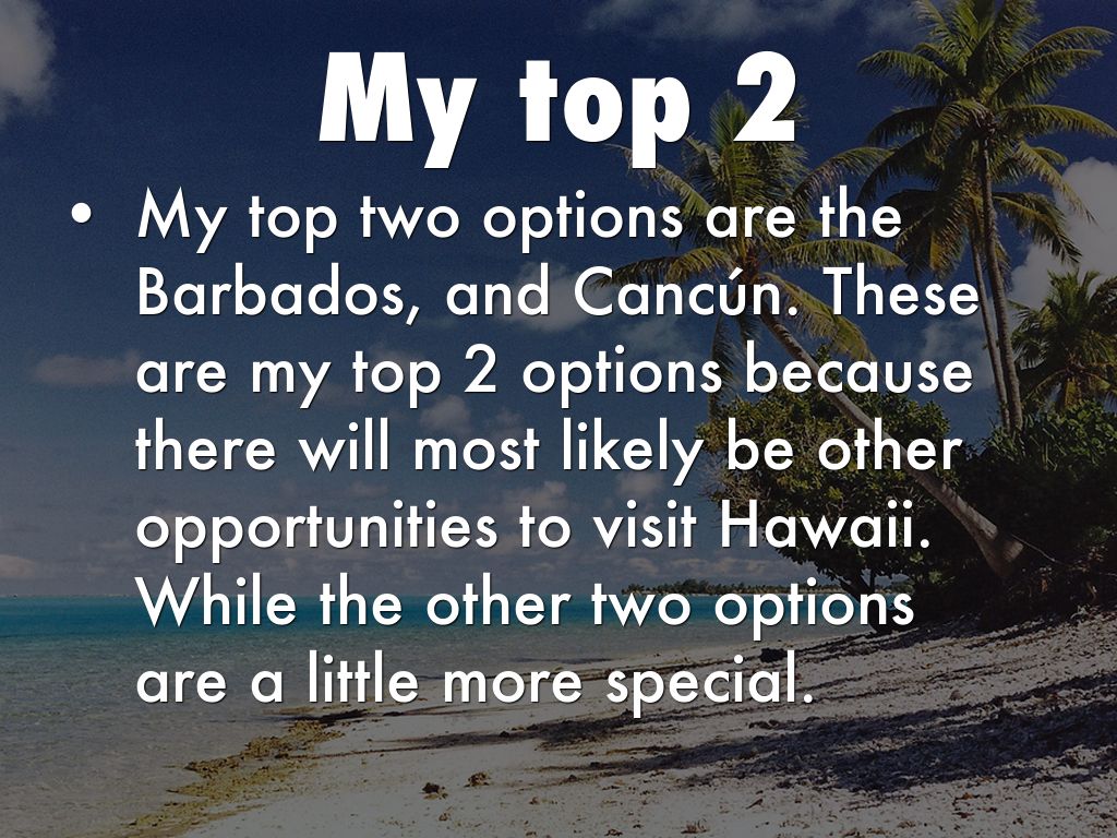 My top two options are the Barbados, and Cancún. These are my top 2 options because there will most likely be other opportunities to visit Hawaii. While the other two options are a little more special.