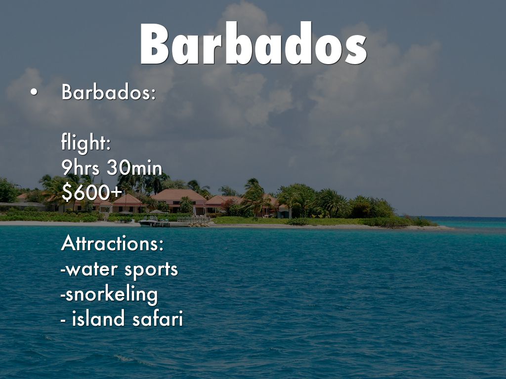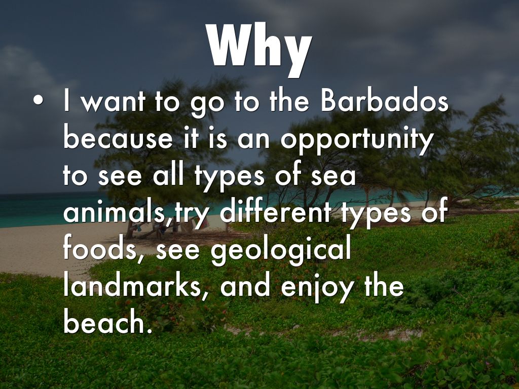 I want to go to the Barbados because it is an opportunity to see all types of sea animals,try different types of foods, see geological landmarks, and enjoy the beach.