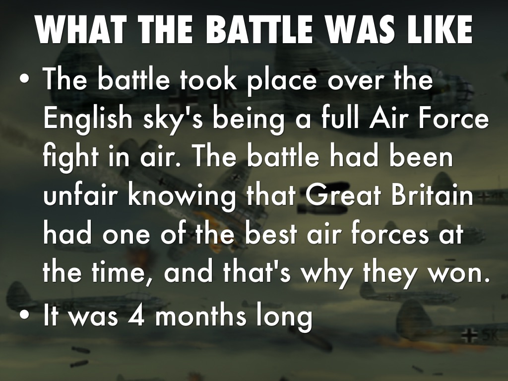 The battle took place over the English sky's being a full Air Force fight in air. The battle had been unfair knowing that Great Britain had one of the best air forces at the time, and that's why they won.