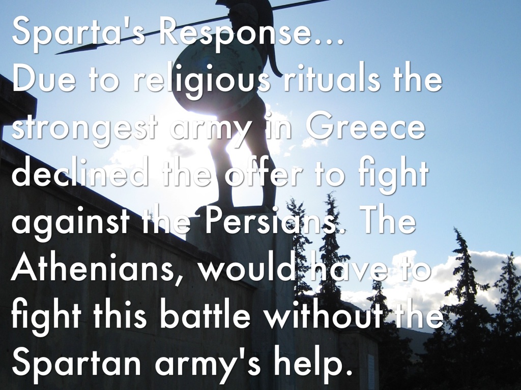 Sparta's Response... Due to religious rituals the strongest army in Greece declined the offer to fight against the Persians. The Athenians, would have to fight this battle without the Spartan army's help.