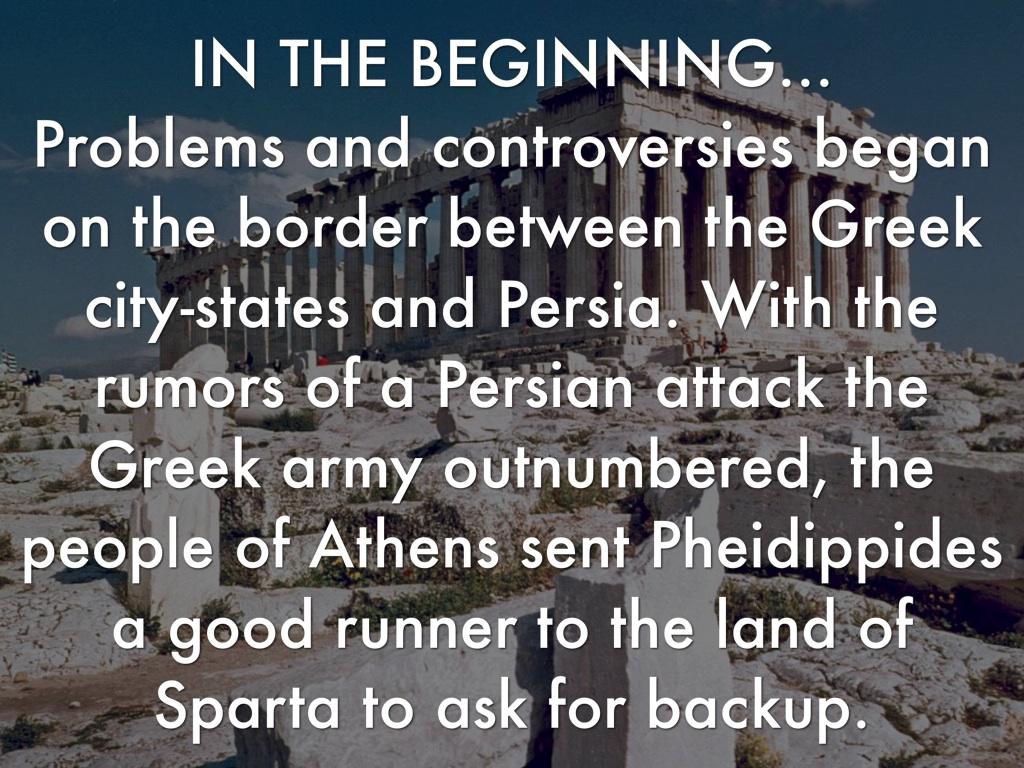 IN THE BEGINNING... Problems and controversies began on the border between the Greek city-states and Persia. With the rumors of a Persian attack the Greek army outnumbered, the people of Athens sent Pheidippides a good runner to the land of Sparta to ask for backup.