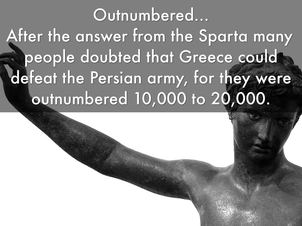 Outnumbered... After the answer from the Sparta many people doubted that Greece could defeat the Persian army, for they were outnumbered 10,000 to 20,000.