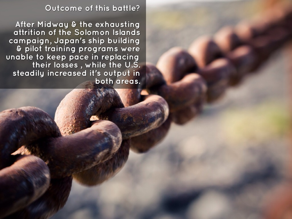 After Midway & the exhausting attrition of the Solomon Islands campaign, Japan's ship building & pilot training programs were unable to keep pace in replacing their losses , while the U.S. steadily increased it's output in both areas.