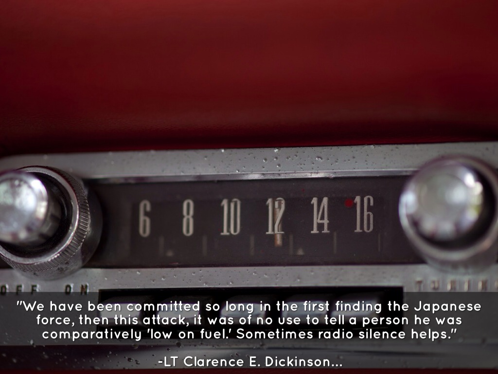 "We have been committed so long in the first finding the Japanese force, then this attack, it was of no use to tell a person he was comparatively 'low on fuel.' Sometimes radio silence helps."