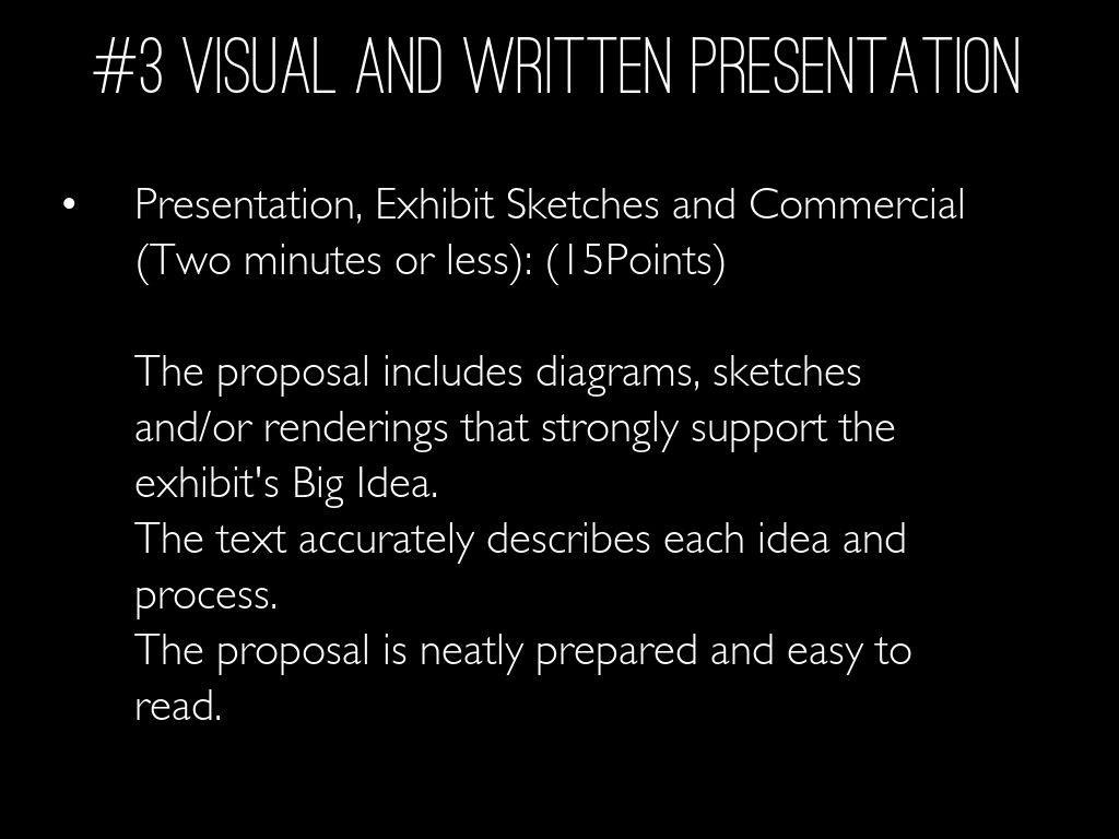 Presentation, Exhibit Sketches and Commercial (Two minutes or less): (15Points)