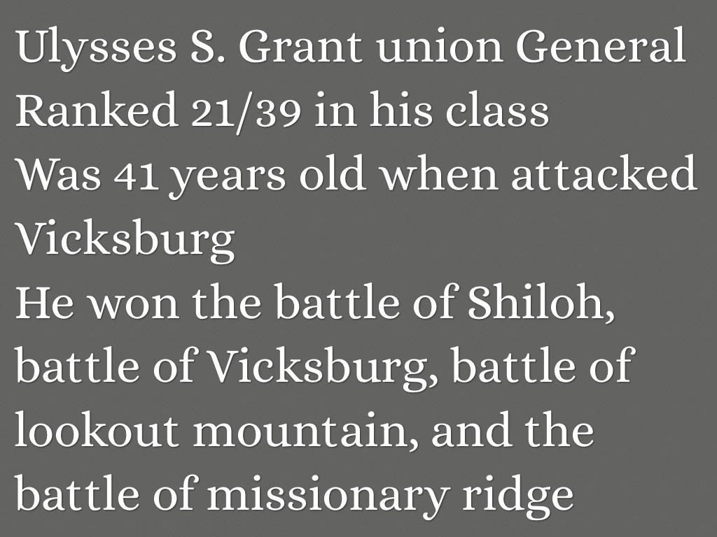 He won the battle of Shiloh, battle of Vicksburg, battle of lookout mountain, and the battle of missionary ridge