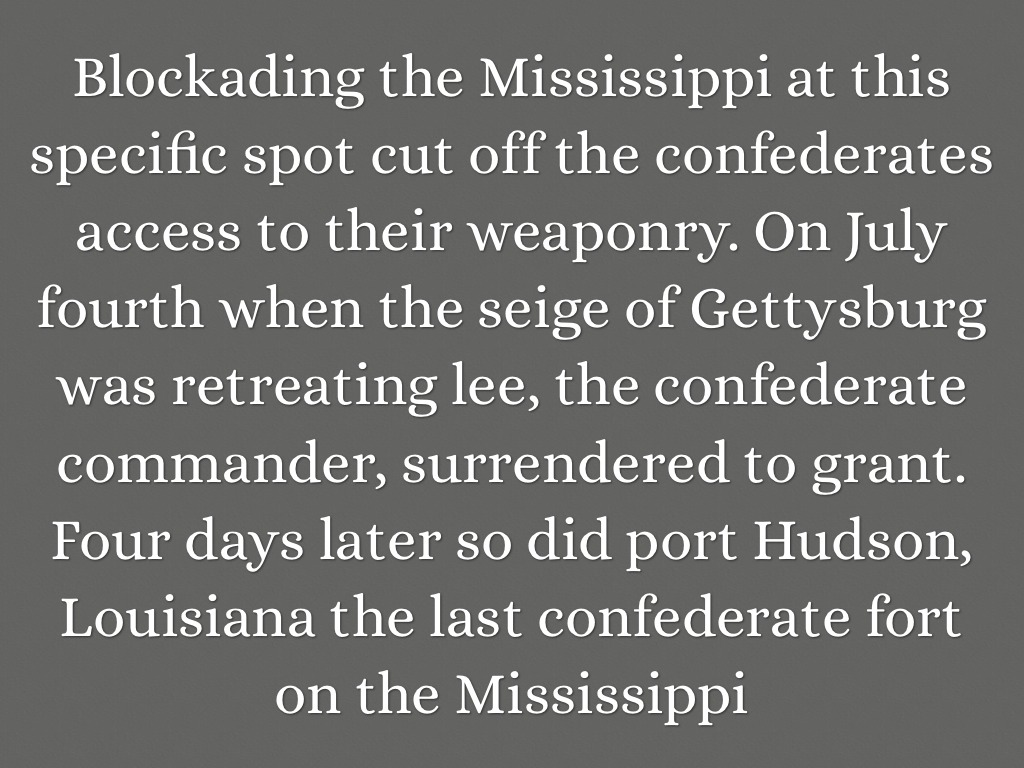 Blockading the Mississippi at this specific spot cut off the confederates access to their weaponry. On July fourth when the seige of Gettysburg was retreating lee, the confederate commander, surrendered to grant. Four days later so did port Hudson, Louisiana the last confederate fort on the Mississippi