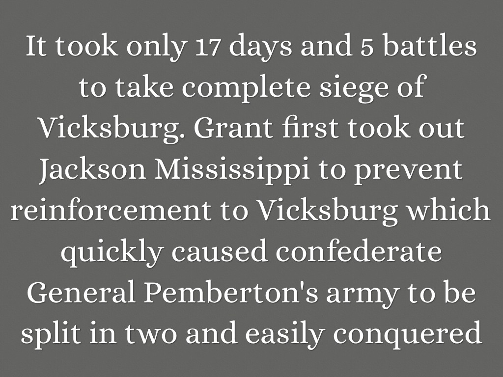 It took only 17 days and 5 battles to take complete siege of Vicksburg. Grant first took out Jackson Mississippi to prevent reinforcement to Vicksburg which quickly caused confederate General Pemberton's army to be split in two and easily conquered