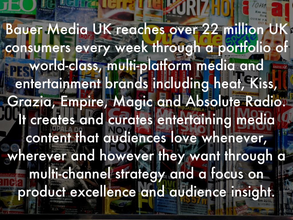 Bauer Media UK reaches over 22 million UK consumers every week through a portfolio of world-class, multi-platform media and entertainment brands including heat, Kiss, Grazia, Empire, Magic and Absolute Radio. It creates and curates entertaining media content that audiences love whenever, wherever and however they want through a multi-channel strategy and a focus on product excellence and audience insight.