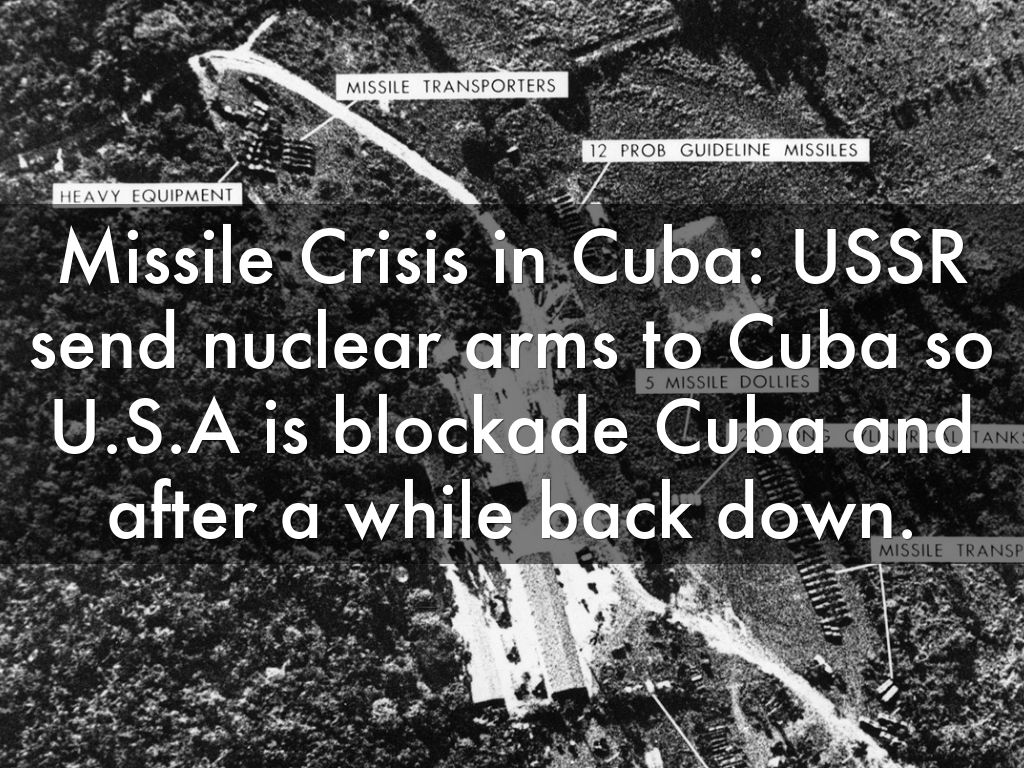 Missile Crisis in Cuba: USSR send nuclear arms to Cuba so U.S.A is blockade Cuba and after a while back down.