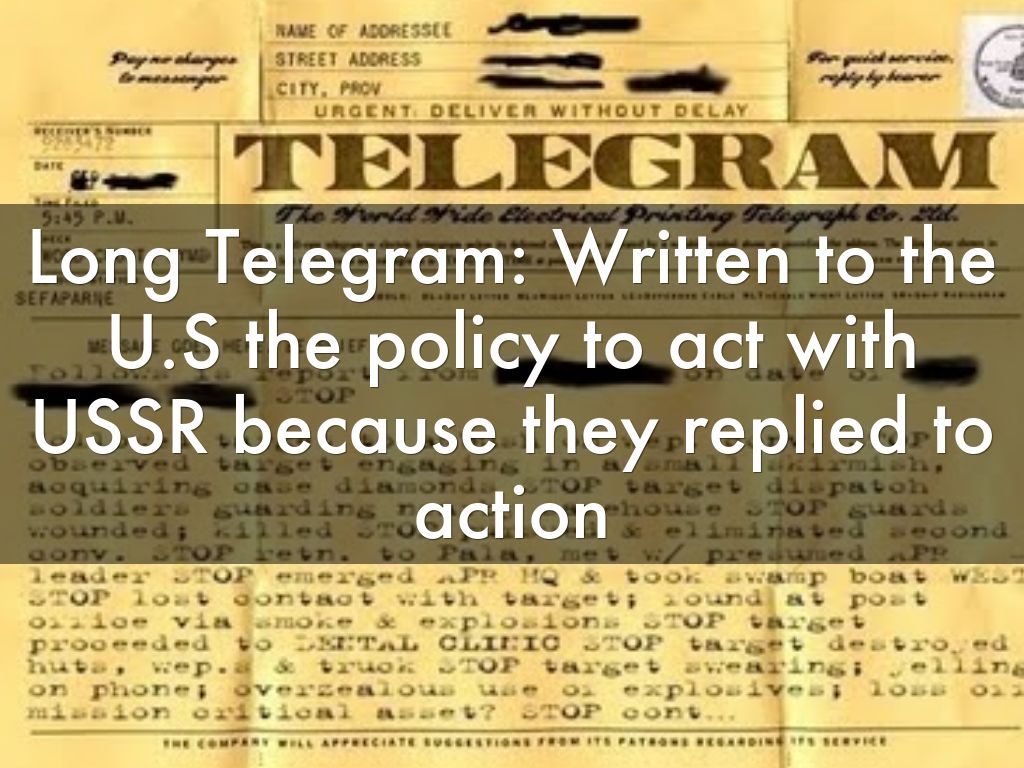 Long Telegram: Written to the U.S the policy to act with USSR because they replied to action