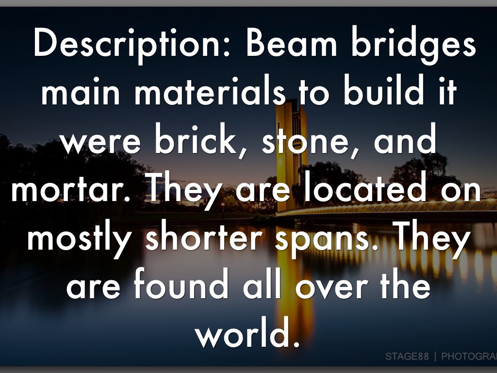 Description: Beam bridges main materials to build it were brick, stone, and mortar. They are located on mostly shorter spans. They are found all over the world.