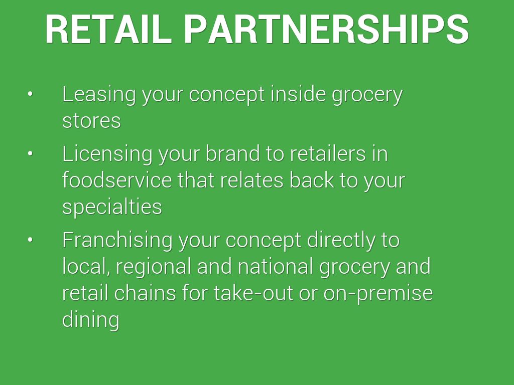 Franchising your concept directly to local, regional and national grocery and retail chains for take-out or on-premise dining