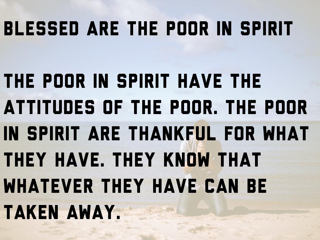 The poor in spirit have the attitudes of the poor. The poor in spirit are thankful for what they have. They know that whatever they have can be taken away.
