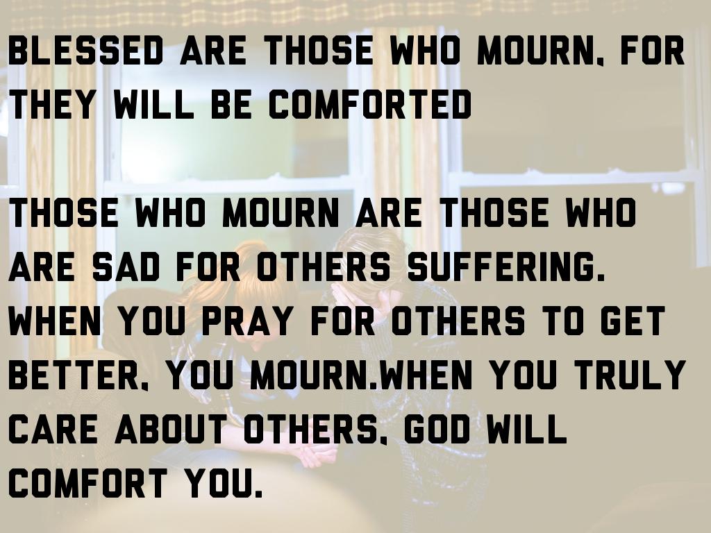 Those who mourn are those who are sad for others suffering. When you pray for others to get better, you mourn.When you truly care about others, God will comfort you.