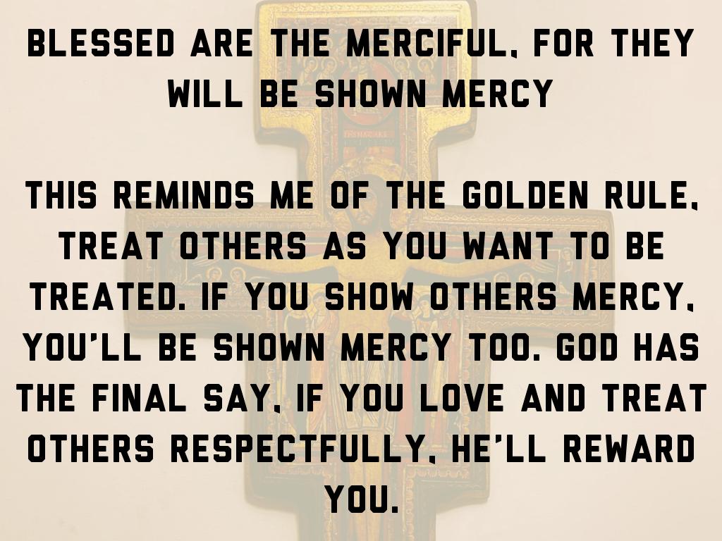 This reminds me of the golden rule, treat others as you want to be treated. If you show others mercy, you’ll be shown mercy too. God has the final say, if you love and treat others respectfully, he’ll reward you.