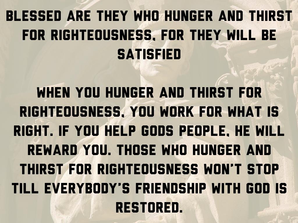 When you hunger and thirst for righteousness, you work for what is right. If you help gods people, he will reward you. Those who hunger and thirst for righteousness won’t stop till everybody’s friendship with god is restored.