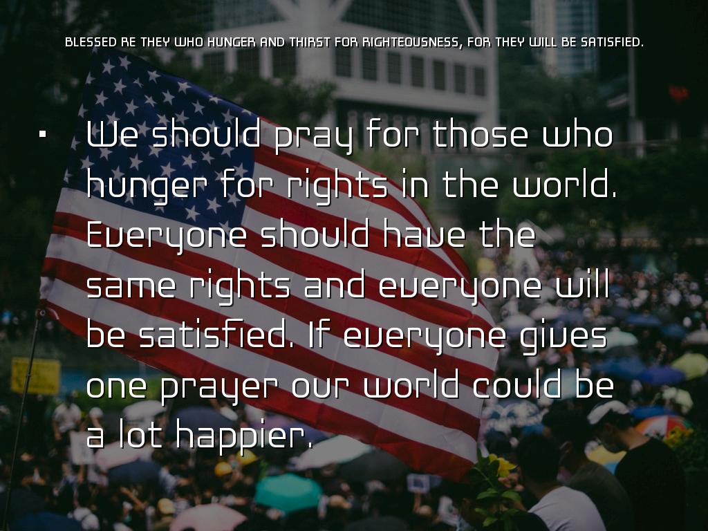 We should pray for those who hunger for rights in the world. Everyone should have the same rights and everyone will be satisfied. If everyone gives one prayer our world could be a lot happier.