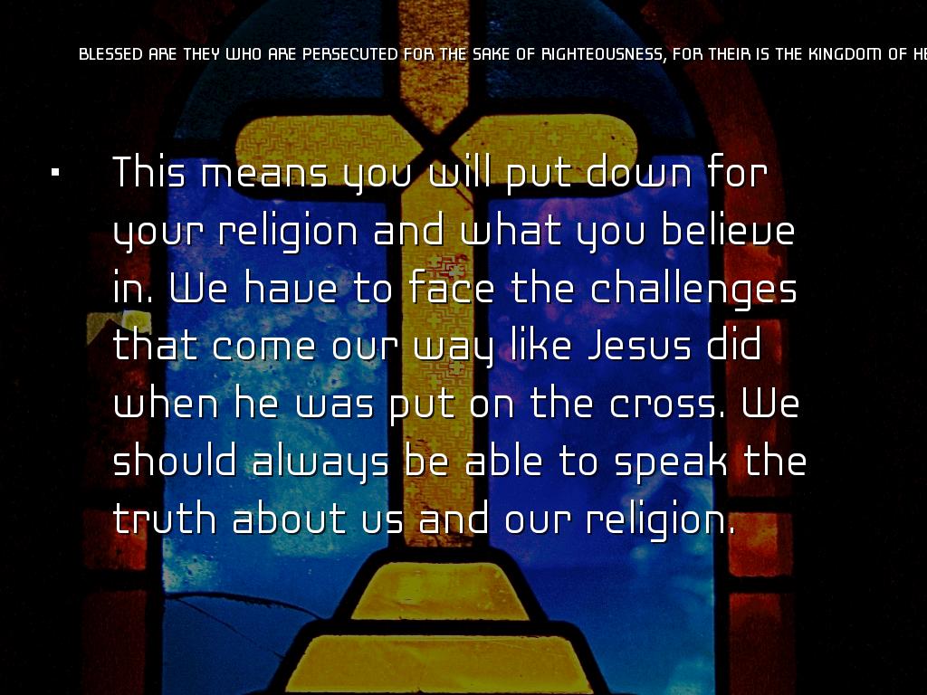 This means you will put down for your religion and what you believe in. We have to face the challenges that come our way like Jesus did when he was put on the cross. We should always be able to speak the truth about us and our religion.