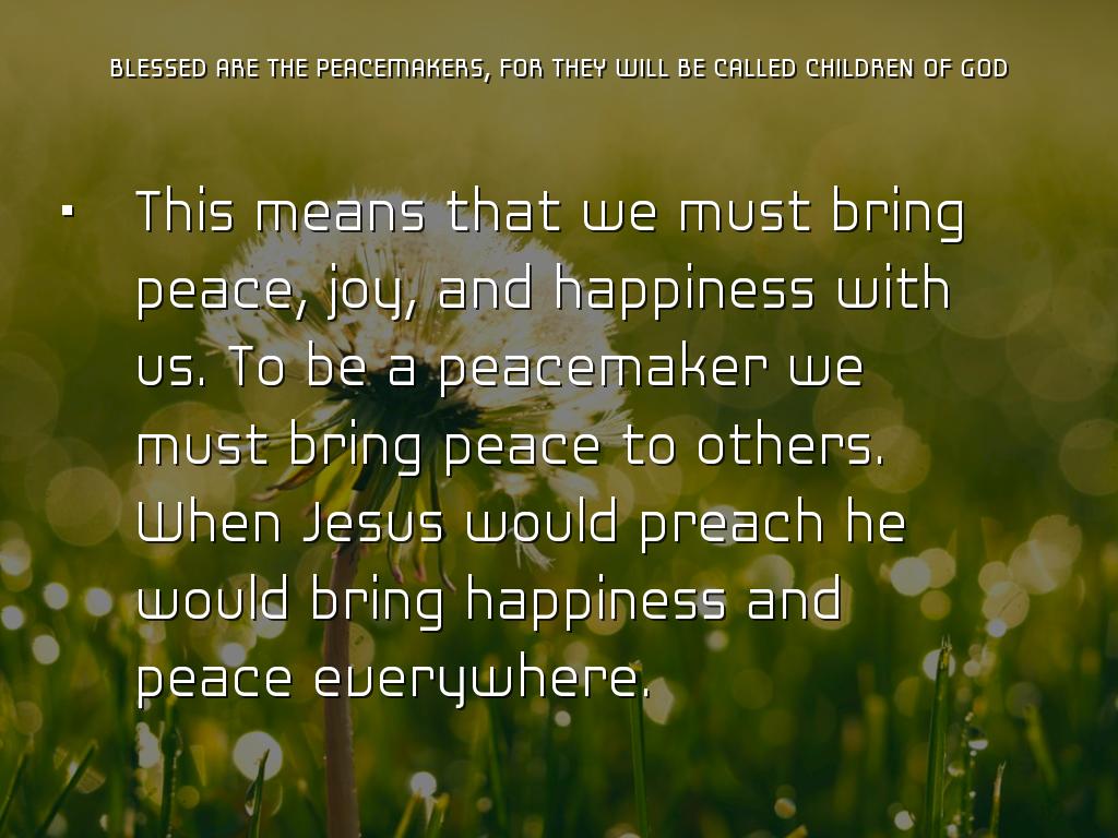 This means that we must bring peace, joy, and happiness with us. To be a peacemaker we must bring peace to others. When Jesus would preach he would bring happiness and peace everywhere.