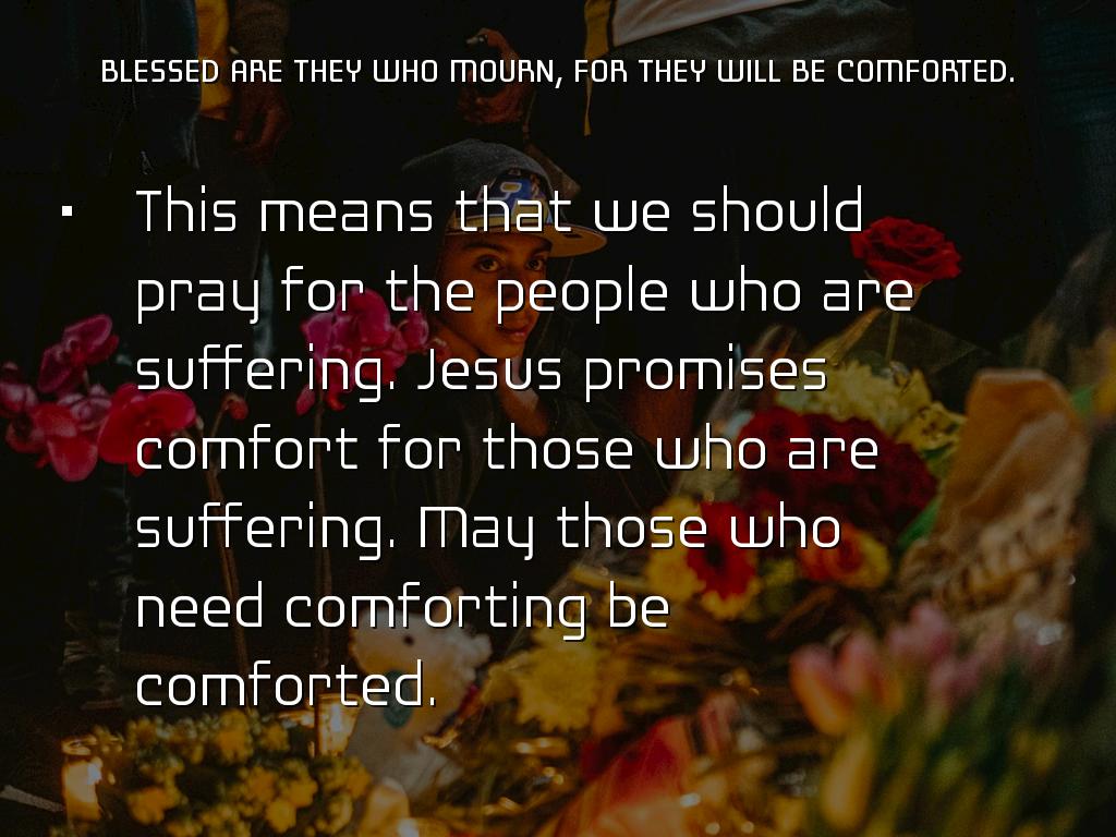 This means that we should pray for the people who are suffering. Jesus promises comfort for those who are suffering. May those who need comforting be comforted.
