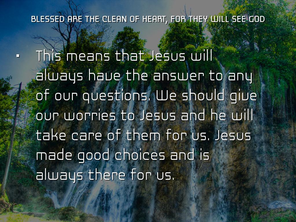 This means that Jesus will always have the answer to any of our questions. We should give our worries to Jesus and he will take care of them for us. Jesus made good choices and is always there for us.