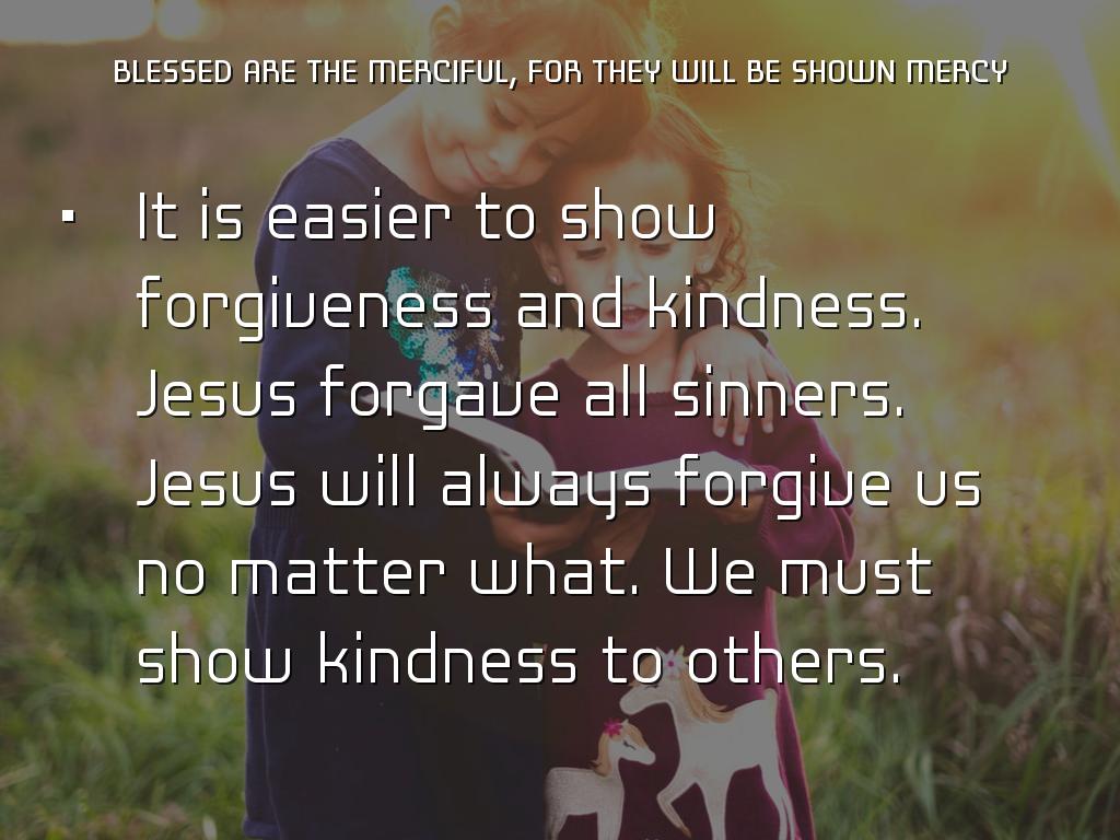 It is easier to show forgiveness and kindness. Jesus forgave all sinners. Jesus will always forgive us no matter what. We must show kindness to others.