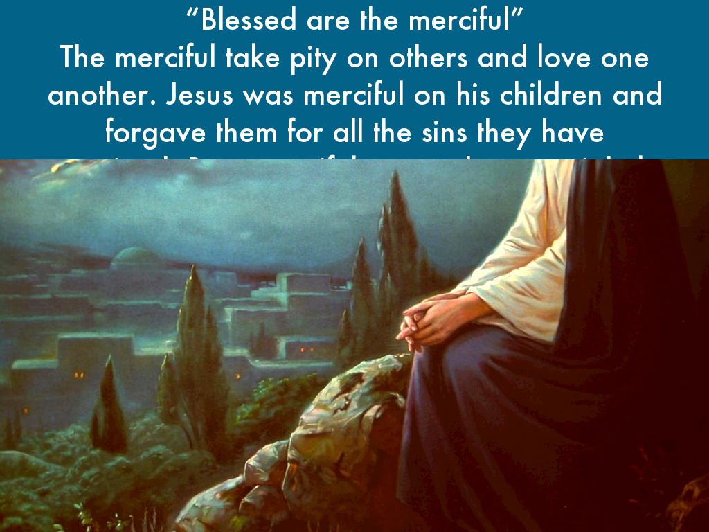 “Blessed are the merciful” The merciful take pity on others and love one another. Jesus was merciful on his children and forgave them for all the sins they have committed. Be a merciful person because it helps you love others so they can love you back in return.