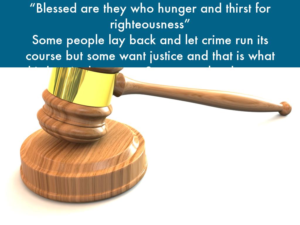 “Blessed are they who hunger and thirst for righteousness” Some people lay back and let crime run its course but some want justice and that is what this beatitude means. Some people who want righteousness are lawyers because they fight for what they think is right. It is good for society to hunger and thirst for righteousness.