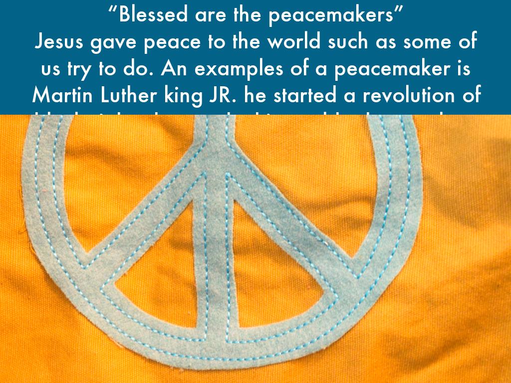 “Blessed are the peacemakers” Jesus gave peace to the world such as some of us try to do. An examples of a peacemaker is Martin Luther king JR. he started a revolution of black rights that made this world a better place to live in. Everyone needs to aspire to be a peacemaker to make the world a better place.