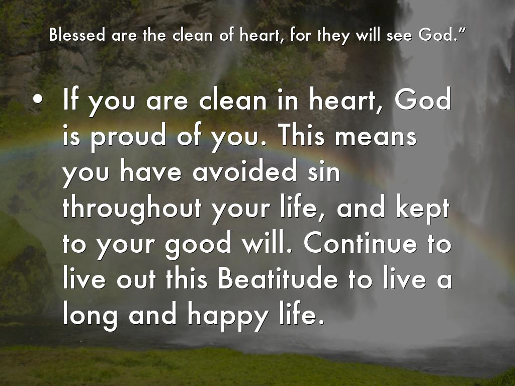 • If you are clean in heart, God is proud of you. This means you have avoided sin throughout your life, and kept to your good will. Continue to live out this Beatitude to live a long and happy life.