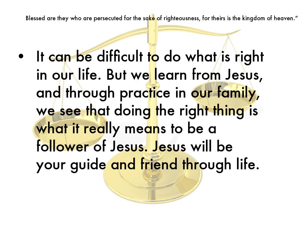• It can be difficult to do what is right in our life. But we learn from Jesus, and through practice in our family, we see that doing the right thing is what it really means to be a follower of Jesus. Jesus will be your guide and friend through life.