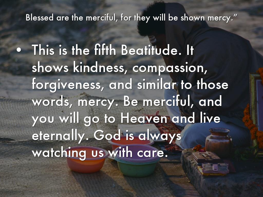 • This is the fifth Beatitude. It shows kindness, compassion, forgiveness, and similar to those words, mercy. Be merciful, and you will go to Heaven and live eternally. God is always watching us with care.