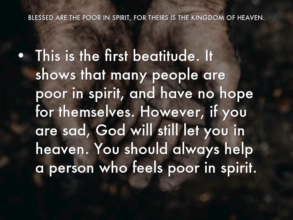 • This is the first beatitude. It shows that many people are poor in spirit, and have no hope for themselves. However, if you are sad, God will still let you in heaven. You should always help a person who feels poor in spirit.