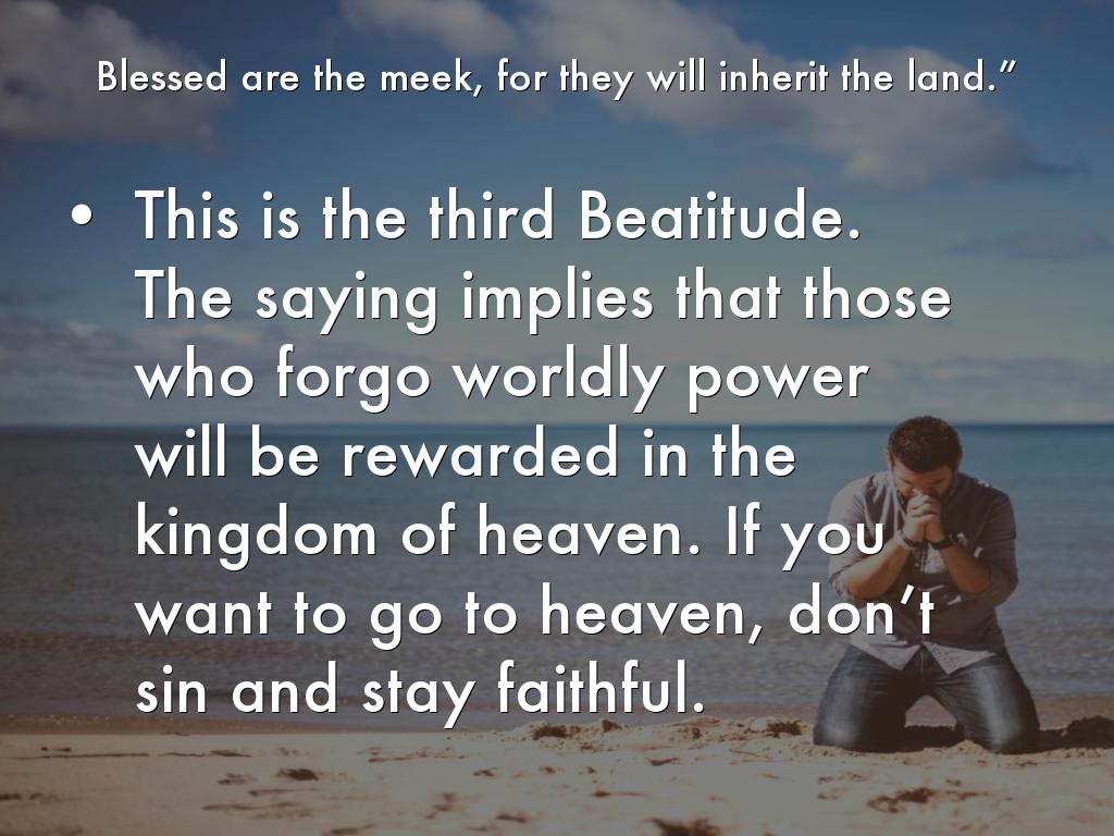 • This is the third Beatitude. The saying implies that those who forgo worldly power will be rewarded in the kingdom of heaven. If you want to go to heaven, don’t sin and stay faithful.