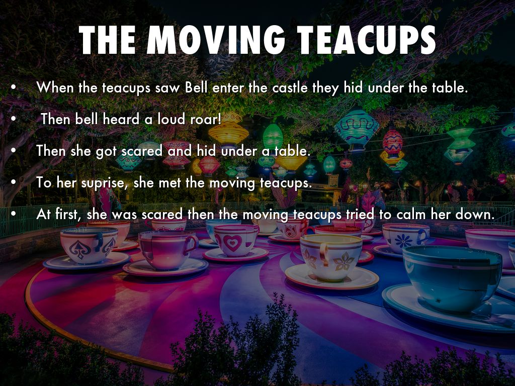 Then a moving teacup heard her yell and came to her and calmed her down.