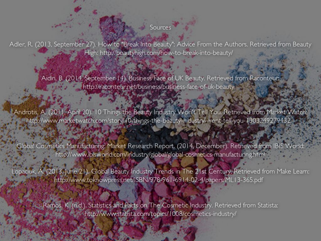 Lopaciuk, A. (2013, June 21). Global Beauty Industry Trends in The 21st Century. Retrieved from Make Learn: http://www.toknowpress.net/ISBN/978-961-6914-02-4/papers/ML13-365.pdf